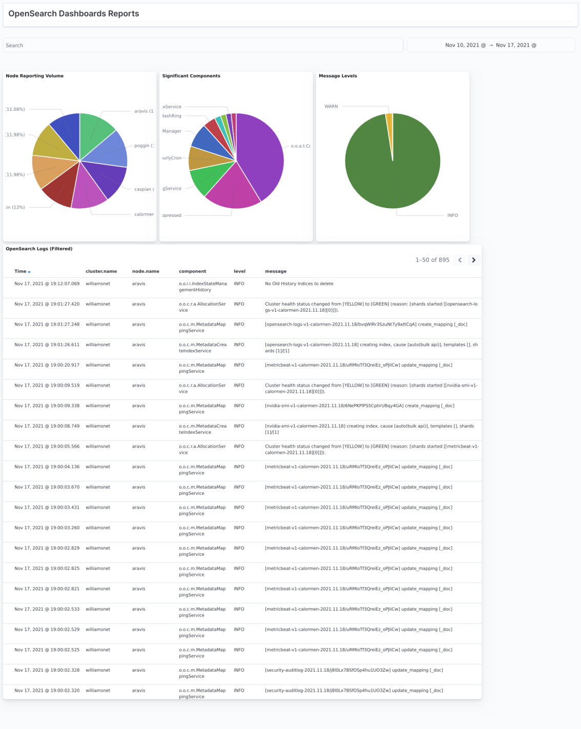 Looking in logfiles for messages can be a difficult prospect as each node independently collects its own output, and the cluster scheduler can assign tasks to different nodes -- and you may not know which node a task is executing on. The solution is to collect all the logs in one place where they can be searched and correlated -- fortunately, there is a place to do that: OpenSearch itself. In an ideal world, there would be a separate cluster to monitor the main cluster -- so that if the main cluster is non-functional, you can analyze logs to identify the cause. Lacking that, the logs can be collected as part of the main cluster.